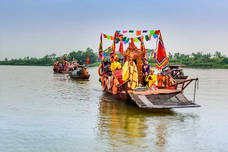 Hàng năm, từ ngày mùng 8 đến ngày 16 tháng 4 âm lịch, lễ hội đền Tống Trân được tổ chức để kỷ niệm ngày sinh của Ngài. Thành thông lệ, ngày mồng 8 tháng 4, Ban tổ chức lễ hội đền Tống Trân tổ chức làm lễ cáo yết; ngày mồng 9, tổ chức rước kiệu từ đền Tống Trân sang đền Phượng Hoàng; ngày mồng 10 tháng 4, tổ chức rước nước và rước nghiên bút. Đây là phần đặc sắc nhất, tạo sự khác biệt của lễ hội đền Tống Trân với các lễ hội khác. Sáng sớm ngày mùng 10, đoàn rước khởi hành, mở đầu cho đoàn rước là đội cờ, sau là phường Bát Âm, nhang án, ngựa đỏ, theo sau là các các cụ hai giới cùng dân làng và du khách thập phương tham gia rước. Ra đến sông Luộc các nghi trượng, kiệu Tống Trân được để trên bờ, chỉ có kiệu chóe nước, bát bửu, đội cờ được mang xuống thuyền. Dưới sông, một chiếc thuyền lớn và năm chiếc đò nhỏ được bố trí để phục vụ đám rước. Việc lấy nước được thực hiện sau khi thầy pháp đã làm lễ xin nước tại vị trí xưa kia Trạng nguyên Tống Trân cầm quản bút ném xuống sông. Sau nghi lễ, vàng mã, hoa quả được thả xuống, sau đó thực hiện nghi lễ lấy nước. Các thao tác lấy nước cũng lắm công phu. Tại vị trí lấy nước được thả một vòng hoa đẹp. Nước được múc đầu tiên là từ đầu nguồn rồi xuống cuối nguồn và ngược lên đầu nguồn lần lượt 3 lần. Nước trước khi được đổ vào trong chóe phải được múc vào một chiếc lọ lục bình, khi cho vào trong chóe, miệng chóe được phủ một tấm vải điều rồi mới đổ vào 1/2 chóe. Trong khi các thuyền đang thực hiện nghi thức múc nước, ở đoạn sông đó mà có thuyền đi qua đều phải dừng lại, mọi người bái vọng về phía đoàn thuyền đang làm nghi lễ lấy nước. Sau thủ tục này, nước được sử dụng để bao sái (lau rửa) đồ thờ, tắm rửa các tượng tại đền. Số nước còn lại một phần vẩy ra bốn phía xung quanh đền để cầu mưa thuận, gió hòa, muôn loài sinh sôi nảy nở, mùa màng bội thu, nhân khang vật thịnh. Phần còn lại, một số đình, đền, chùa trong làng xin nước về bao sái đồ thờ hoặc để thắp hương nhân ngày Rằm, mùng một.